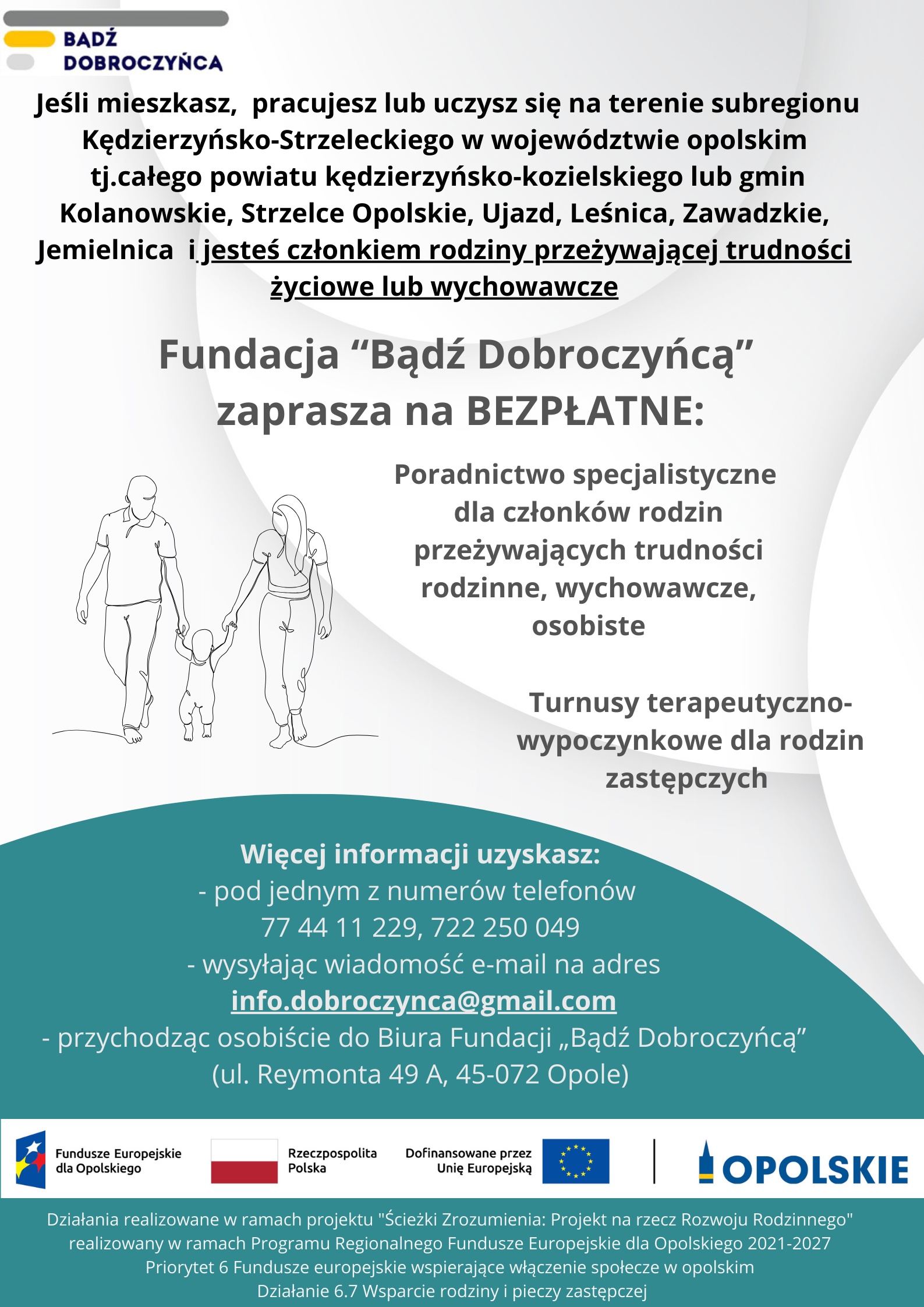 Wsparcie jest realizowane w ramach projektu pn. „Ścieżki Zrozumienia: Projekt na rzecz Rozwoju Rodzinnego" realizowanego w ramach Programu Regionalnego Fundusze Europejskie dla Opolskiego 2021 – 2027 Priorytet 6 Fundusze Europejskie wspierające włączenie społeczne w opolski, działanie 6.7 „Wsparcie rodziny i pieczy zastępczej” i jest bezpłatne dla rodzin.