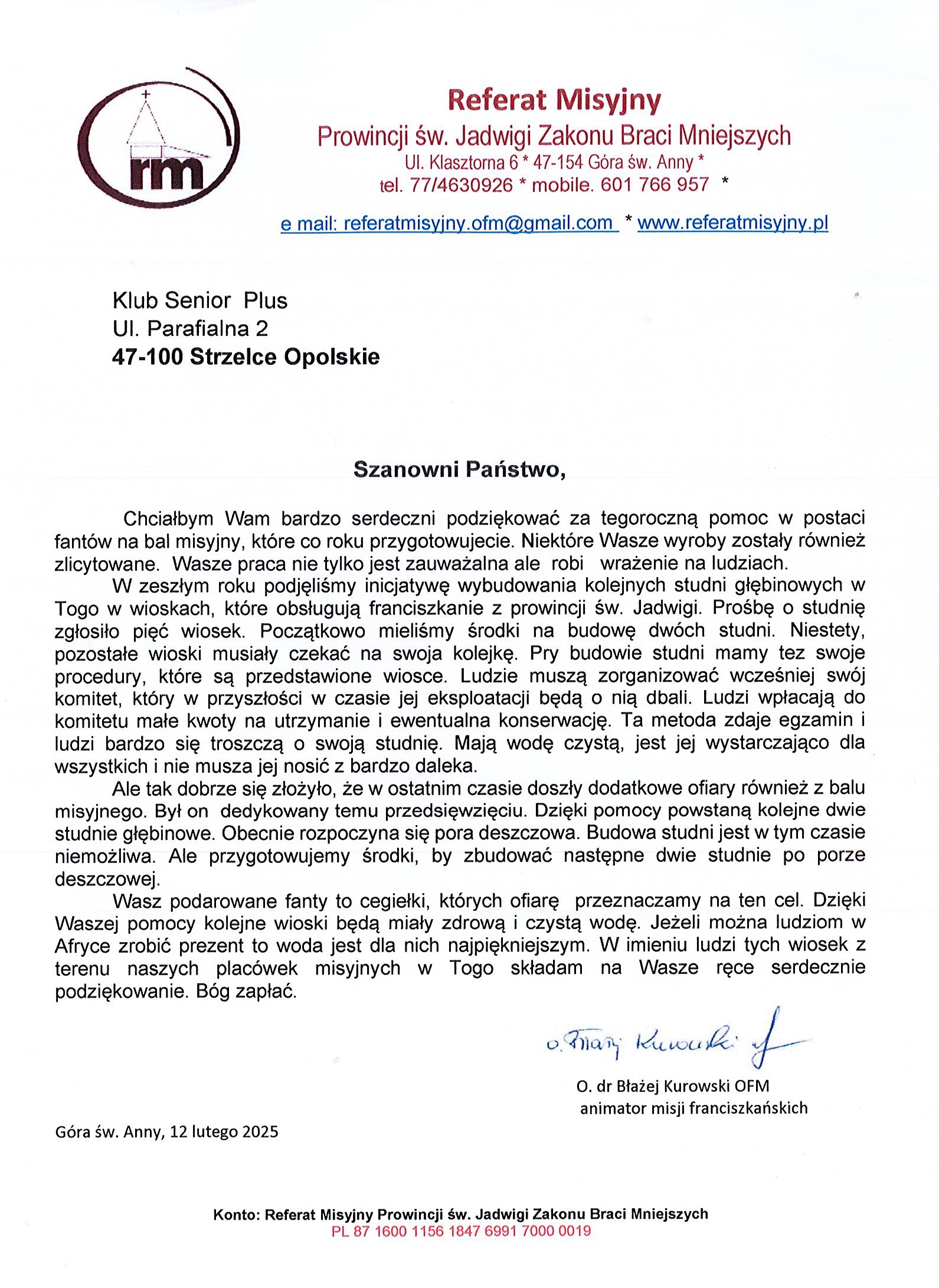 Uczestnicy Klubu Senior + otrzymali podziękowania od Ojca dr Błażeja Kurowskiego OFM animatora misji franciszkańskich za pomoc w organizowanym przez siebie Balu Misyjnym.