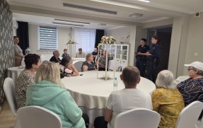 Tematem rozmowy były oszustwa oraz ochrona danych osobowych. Poruszono temat bezpieczeństwa podczas rozmów telefonicznych, uczestnictwa w imprezach masowych oraz wycieczkach jak i również poruszania się seniorów w internecie. Mieszkańcy mogli zadawać pytania oraz dzielić się swoimi doświadczeniami. Na zakończenie spotkania, każdy z uczestników otrzymał upominek w postaci odblasku oraz notatnika z magnesem.